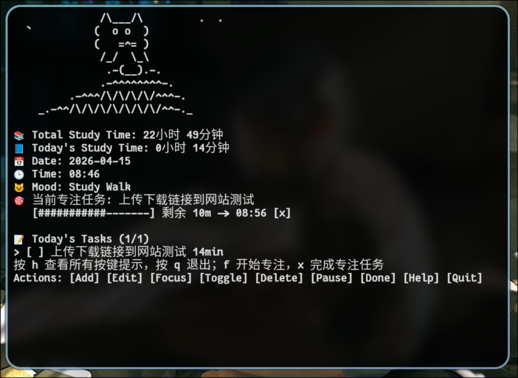TermBuddy 是一个面向终端用户的学习陪伴工具。它把学习时长统计、今日待办管理、专注倒计时、任务进度展示和宠物化交互整合到一个命令行界面里。你可以直接在终端里开始学习、管理当天任务、选择当前专注内容,并在学习过程中获得一个会移动、会切换状态的小猫陪伴反馈。它适合喜欢终端工作流、希望减少切换成本,同时又想保留一点仪式感和陪伴感的人。